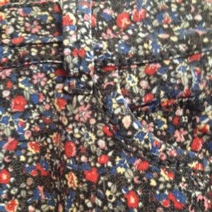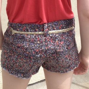 Denim floral patterned cut-off shorts. Stitching at bottom to prevent further fraying.
