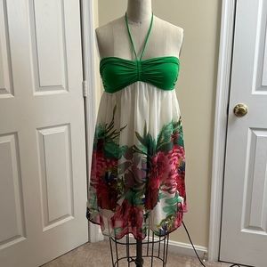 Tied at neck and ruched neckline. Flowy and light dress perfect for spring/summer. Top neckline to hem 27” at center.