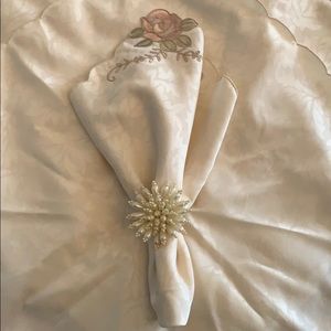 These beautiful creame colored dinner napkins have a light pattern that is tone on tone. The edges have some beautiful rose and green embroidery. They go perfect with the pearl napkin rings in another listing. Bundle together for a discount. Never used.