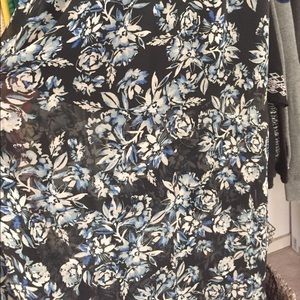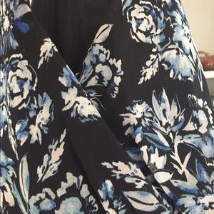 Navy floral faux wrap dress with under slip that goes to mid thigh. Bottom of dress with slight high-low and side slits that are see through. Like new!