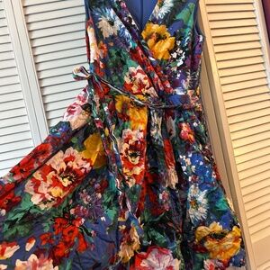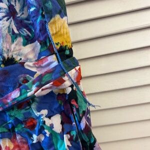 This is a very vibrant fit and flare dress size 14. One of the belt threads is broken but easily fixed. This is from a smoke free home.
