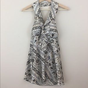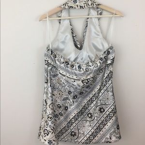 95% polyester 5% spandex. Gently used. No signs of wear. Hidden zipper on side. Slightly padded top for nice fit.