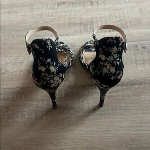 floral heels, very minor wear. Snaps are intact on ankles, satin like finish. Very good condition. Open to offers