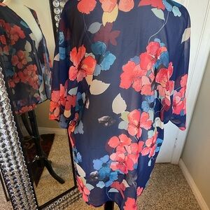 Beautiful floral kimono cardigan. Vibrant colors in a sheer, lightweight flowy fabric. Goes with everything. Dresses, pants, shorts, etc.
