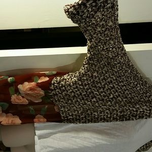 Awesome mix of open knit sweater on top and floral sheer on bottom. Love it, but it's too big for me.