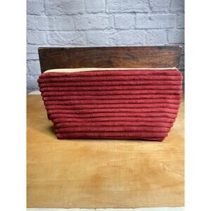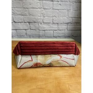 This makeup bag is made from upholstery fabric it’s lined and has a leather zipper pull it’s 13” wide and 6” deep 4” base