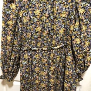 Adorable floral midi dress with slightly puffed shoulders, smocks cuffs, and ruffled collar waist and hem. Keyhole button closure in the back. Worn three times