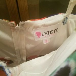 Only worn once to try on and was a little too big. It has spaghetti straps and a pleated full A-line skirt. Modeled cups so ok to go braless. Bought from a local boutique and has just been taking up space in my closet.