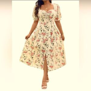 Floral midi dress sweetheart neckline button front puff sleeve feminine Dress XS