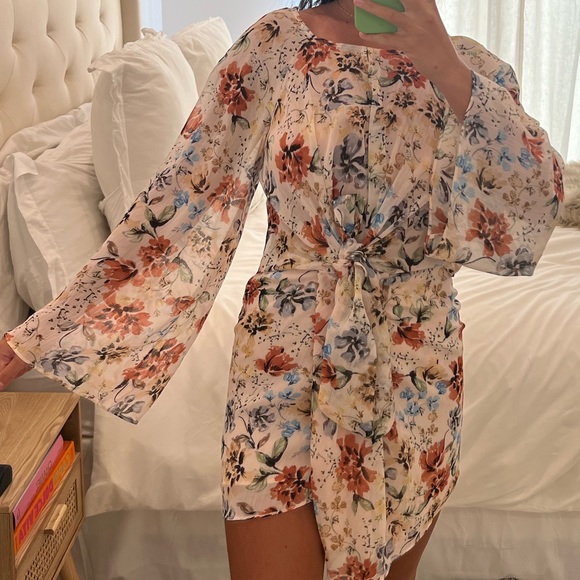 Floral mini dress with drape sleeves and zipper back. Worn once.