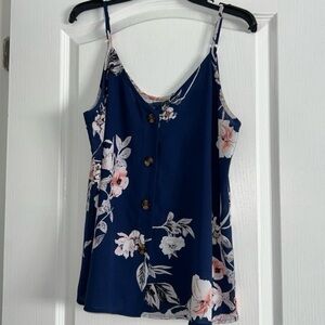 Used in excellent condition, Floral, navy blue, white, & pink button down tank top. Size Large with adjustable straps. Lightweight, perfect for warmer weather or worn to the office.