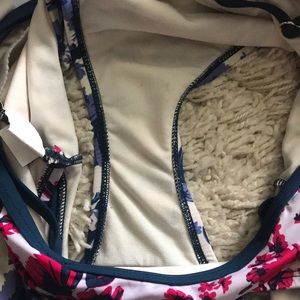 One piece floral bathing suit. Cut outs on the back. Tie lace up on the front. Adjustable straps. Hardly worn. Size medium. Bought at Dillard’s.