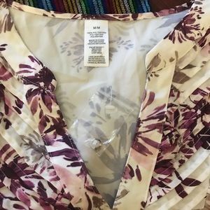 100%. Polyester blouse with a lovely purple , lilac and light brown - tan floral pattern with POCKETS! . Fits a bigger on the larger side of size M- possibly fit as a dress . Very light and paired great with any black bottom .
