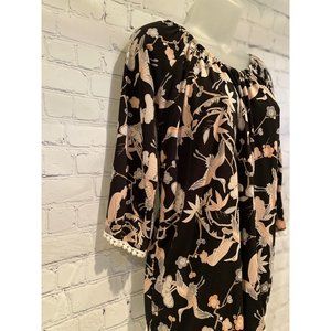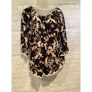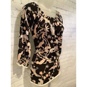 This beautiful women’s peasant blouse with Colorful flower And butterfly detail is perfect for summer extremely lightweight and comfortable with three-quarter sleeves and lace detail around the bottom and the sleeves