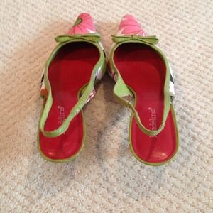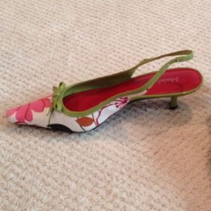 Pointed-toe sling back shoe with large floral motif and 1 in. heel. (Slight signs of wear on toe)