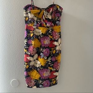 Beautiful Anthropologie floral dress with a tailored silhouette and a side zipper closure. In excellent used condition. Size 2. Waist measures 13 inches across when laying flat. Can be worn strapless or with spaghetti straps.