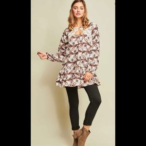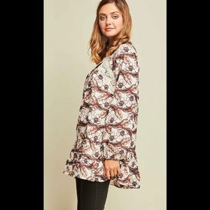 Floral print drop waist tunic top featuring cutout detail front and back. Self tie back closure, elasticized cuffs. Non sheer, light weight. 100% polyester