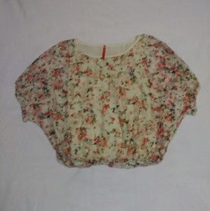 Super fun and flirty! Corral colored flowers printed I on cream colored lace overlay. It's not exactly a crop top by any means but it does sit slightly above the hips on me (I'm 5'4") in a cute way. Tag says it's a medium but it feels like an XS to me as I swim in a medium. I am listing it as an XS as to not misrepresent it as a true medium. ❤️