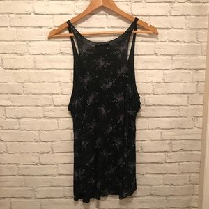 Black knit tank with violet, white and purple floral print (best to see in close up pic). Surge hem finish. Very slouchy, relaxed look. Great for layering, and loose for those hot days! Worn once or twice. Same condition as when bought- this brand has a very relaxed finish look!