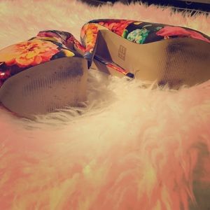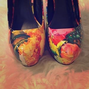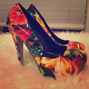 6" tall heel. Platform so it is easy to walk on. Colorful floral design so it is easy to pull off any outfit. Fun for summer night out. Wear only once. Good condition