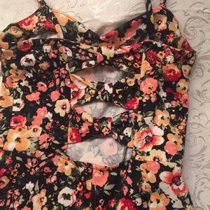 Cute black romper with floral design. Spaghetti straps with bow design on back. Worn once or twice. Size small, bought at Wet Seal.