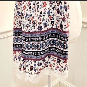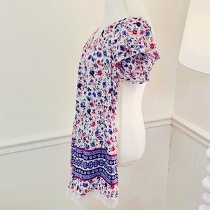 Floral printed off shoulder romper 100% polyester. Flutter sleeves with adjustable shoulder straps. Flutter sleeves fall off shoulder. Strap stays on shoulder. 💕