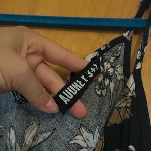 Audrey 3+1 black floral romper. Has a crisscross chest detail on the front. No pockets. Super comfortable, worn once