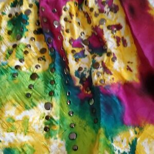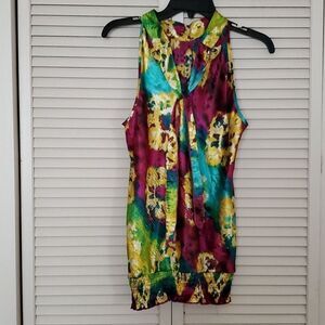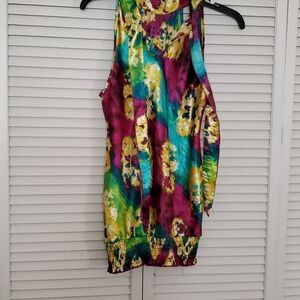 Floral satin with embellishments Slit at back with tie at neck Elastic rusched waistband N9