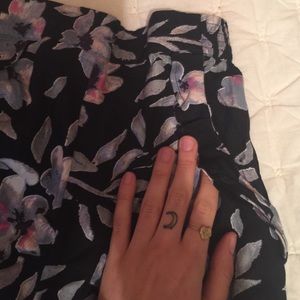 High waisted black floral shorts with elastic waistband and cute ruffle lined pockets.