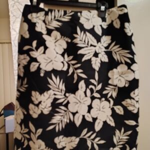 this is a size 14 tablet skirt black with cream flowers shell of the skirt is 100% cotton and the lining is 100% polyester 97% Polyester 3% Spandex Wash cold gentle tumble dry on low. Wear this COTTAGE CORE PREPPY AMERICAN ROYAL WEDDING POLISHED MINIMALIST CHIC WITH FLORAL DELICATE LOOK. VERY COMFORTABLE ASYMETRICAL FLORAL DESIGN WITH LAYERS. LOOKS WAY BETTER IN PERSON. THIS PICTURE DOES NOT DO JUSTICE.
