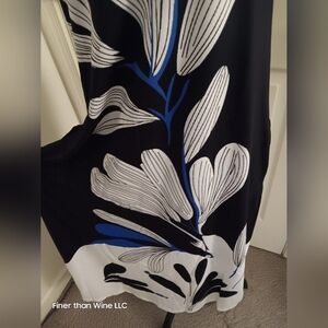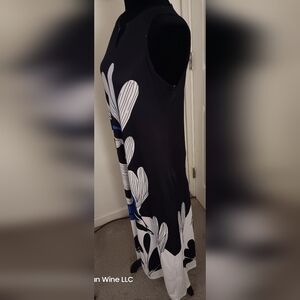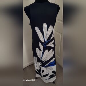 New Without Tags, never worn. Floral design sleeveless black, white, and blue shift full-length dress with pockets. 95% Polyester 5% Elastane. Women's Size S.