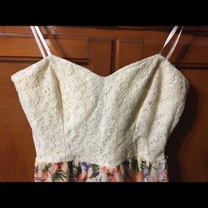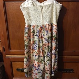 Super cute spring/summer floral strapless dress, Size 11 in junior, but I’m 21 and it fits just fine. I’ve only worn this once, it comes to about knee length. Theres a latch above the zipper to help it stay on, and the lace top has a very thin padding.