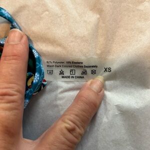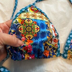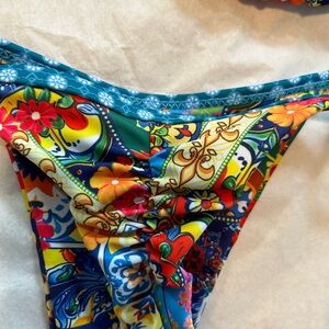 Stylish bikini set with a vibrant blue multicolor, floral pattern. Features French cut back with rushing. Removable padding, Perfect for beach days. French cut styling bathing suit was bought on Amazon it has never been worn.