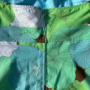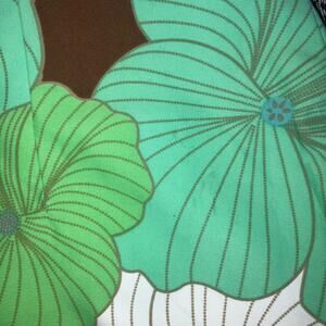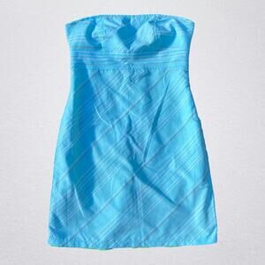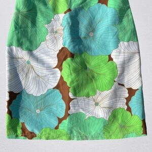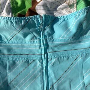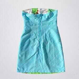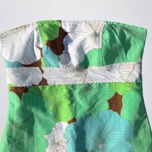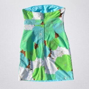 Y2K floral reversible strapless mini dress. 2000s, bohemian, boho chic, hippie. One side is brown with a large multicolor (blue, green, white) groovy tropical floral print. The other side is blue with a white and brown dotted vertical stripe pattern. Size small. Pit to pit measures 15.75". Pit to hem just over 25.25". Good condition pre owned, but dress has some light stains on it in various spots as pictured.