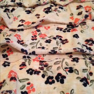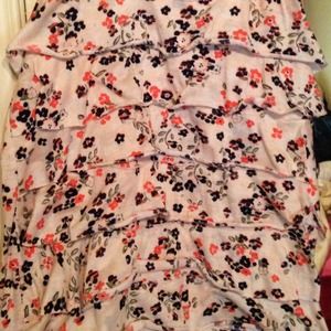 Ruffled. Floral. Bright colors. Worn but good condition. 100% polyester