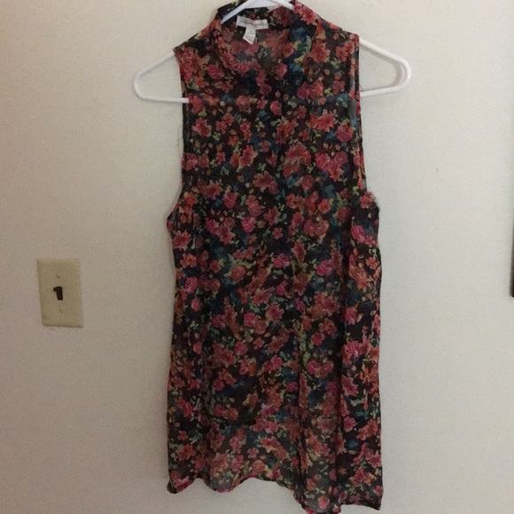 Floral top with a high color and no sleeves fill bottom down with a high low hemline