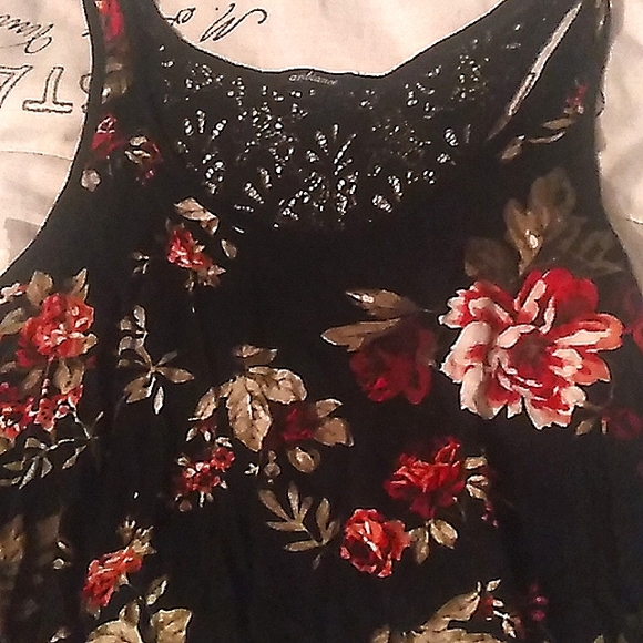 Sm red, pink, and olive floral top by ambiance has more of a racer back to shoulder blades and then becomes open backed.