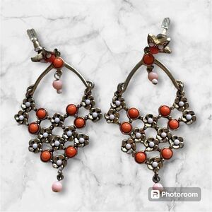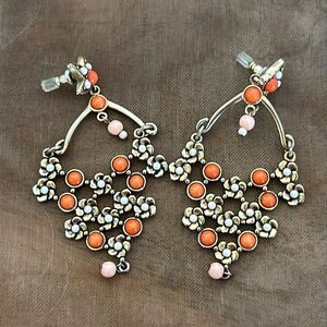 Gorgeous beaded chandelier earrings with gold flowers, white, orange, and pink beads