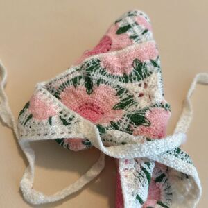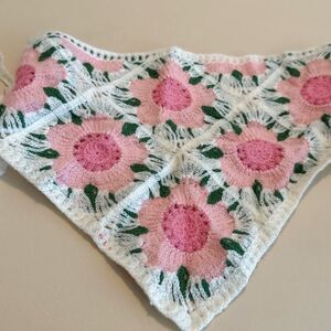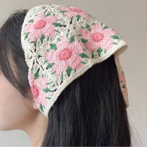 Add a touch of elegance with this floral crochet headband. Featuring beautiful pink flowers on a cream background, it's perfect for any occasion.