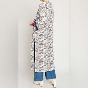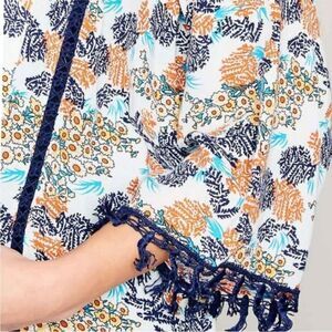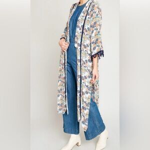 Floral Kimono. Beautiful floral print with navy accents and fringe along sleeves. Approximately 49” long.