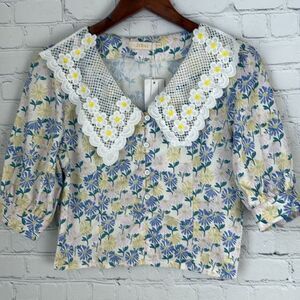 Floral Lace Collar Women's Top - Blue and Yellow Small
