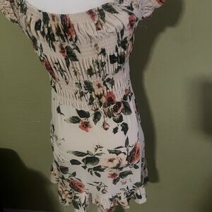 Embrace elegance with this floral off-shoulder dress. Perfect for any occasion, it features a beautiful blend of cream and pink hues. The smocked bodice ensures a flattering fit.