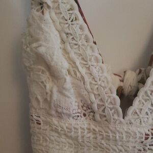 The most Adorable Floral and Crochet Romper with Open Tie Back. Fully lined so it is not see through. Spaghetti Straps.
