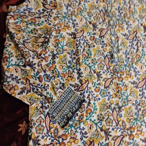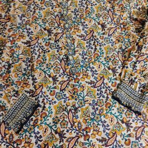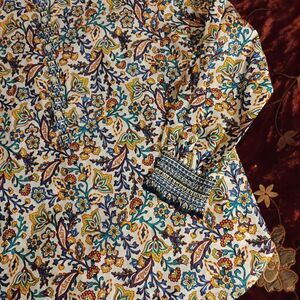 Chic floral blouse with vibrant colors. Features a detailed pattern and stylish cuffs.