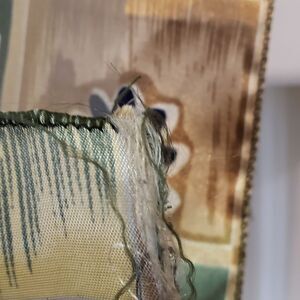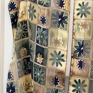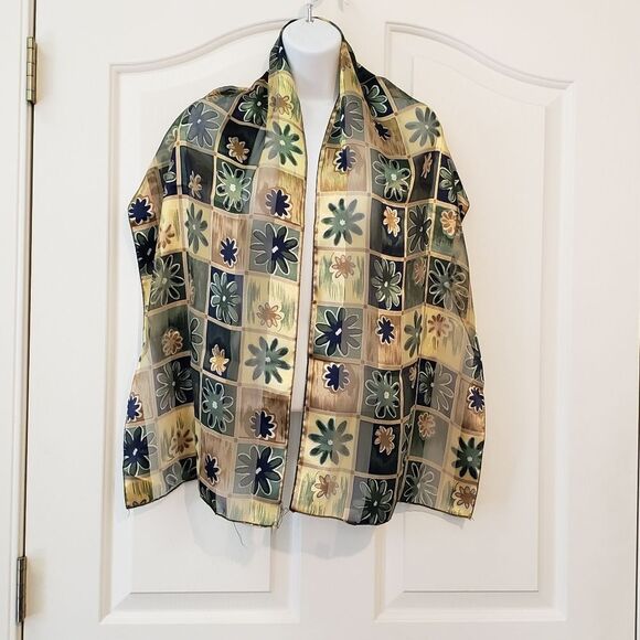 Elegant scarf with a floral pattern. Features shades of green, gold, and blue.