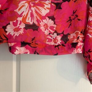 Bright floral blouse with flowing design. Features bold pink and black hues. Perfect for adding color to your outfit.
