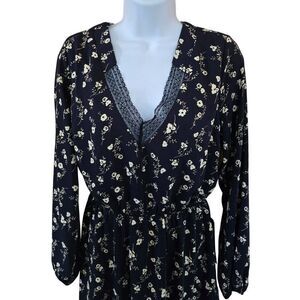 Floral Print Dress Lace Trim V-Neck Long Sleeve Navy & White fairycore flowers
