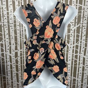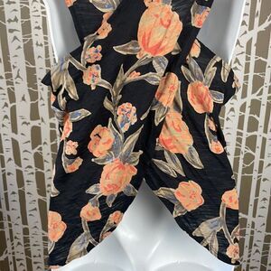 Lucky Lotus Dark Floral Print Boho Cross-Back Tank Top. Features ultra lightweight & breathable cotton modal blend fabric in black with allover floral print in shades of peach, orange, blue, tan & olive green, long line hem that drops low in the front, cross-over back design that hits higher and shows a little bit of your back. Shows no signs of wear or flaws to note. Size S - see pics for measurements.