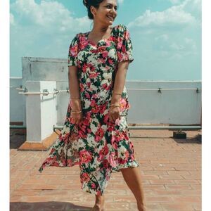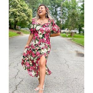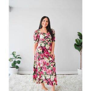 Calf-length dress in woven fabric with a printed pattern. Square neckline, decorative gathers at front, and concealed zipper at back. Short puff sleeves with smocked cuffs, seam at waist, and gently flared skirt with a slit at front. Unlined.