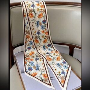 Elevate your style with this elegant floral silk scarf. Featuring a beautiful cream base with vibrant blue and orange floral patterns, this accessory adds a touch of sophistication to any outfit.